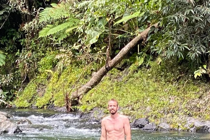 A primeira parada foi numa cachoeira que dá para ver da janela do carro — não dava para parar, mas o José diminuiu a velocidade para todo mundo admirar. Água caindo a 26 metros, branca no meio de tanto verde. Depois veio a caminhada pela floresta. O caminho estava escorregadio em alguns trechos (escorreguei uma vez, mas quem nunca?), e quando chegamos ao rio, alguns pularam direto na água. Eu hesitei porque parecia fria — mas acabei entrando também. A água era cristalina e surpreendentemente gelada; até hoje lembro a sensação na pele depois daquela trilha sob o sol.