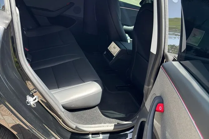 Um Tesla Model 3 privado, sedan de luxo com vidros escurecidos e bancos premium de couro.