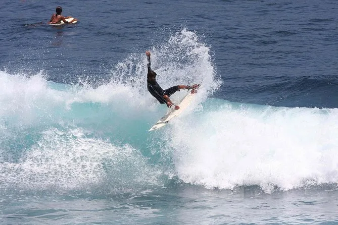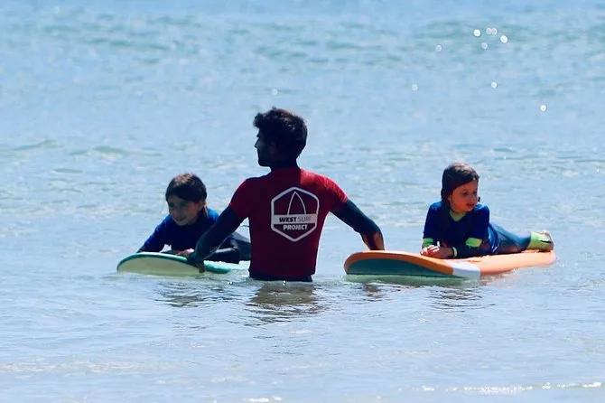 Sua aula inclui transporte privado até a praia, todo o equipamento de surf (wetsuit, prancha, leash) e seguro esportivo. Também há assentos especiais para bebês disponíveis.
