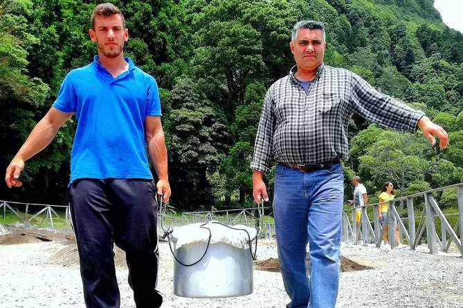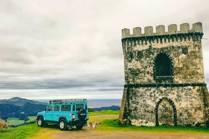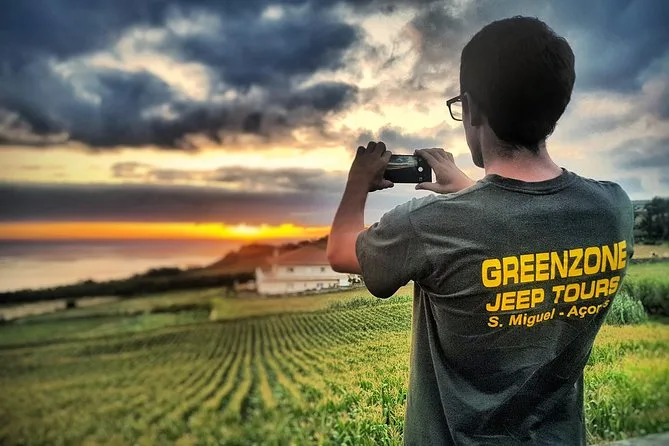 Seu dia inclui transporte de ida e volta do hotel ou porto em Ponta Delgada (maioria dos hotéis), passeio guiado de jeep por estradas secundárias até a cratera das Furnas com visitas a plantações de chá e caldeiras, cerveja, vinho e refrigerantes ilimitados no almoço (cozido cozido no vapor vulcânico), além de tempo para relaxar nas piscinas termais antes do retorno à noite.