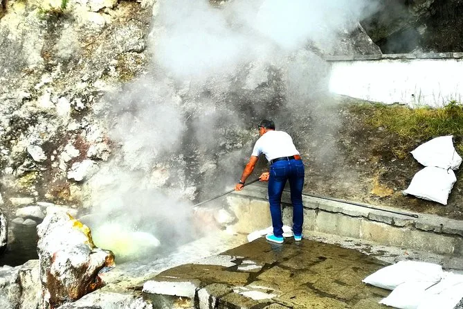 Você vai percorrer estradas sinuosas até Furnas com um guia local, provar chá fresquinho direto da plantação, ver o cozido saindo fumegante da terra vulcânica, relaxar nas piscinas termais quentinhas e voltar para Ponta Delgada — tudo isso com bebidas incluídas e várias surpresas pelo caminho.