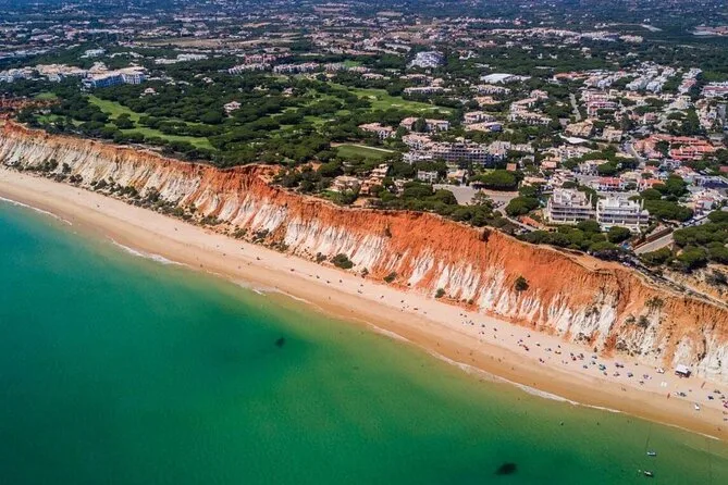 Você verá a Praia da Falésia, pequenas praias escondidas acessíveis só de barco na maré alta e passará pela vila de Olhos de Água.