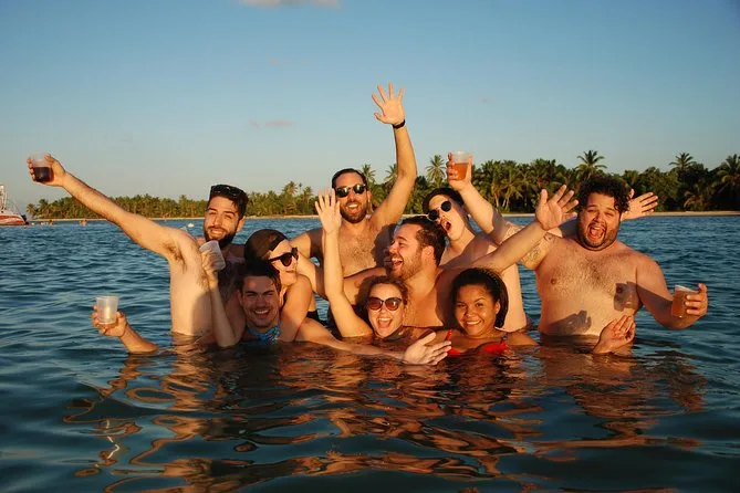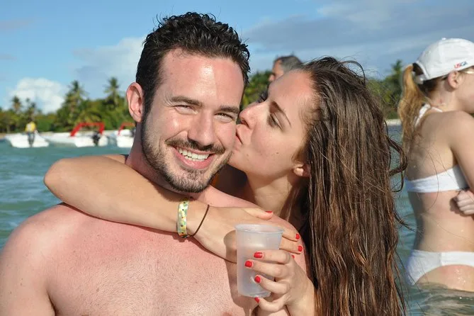 Depois, seguimos para uma área rasa chamada piscina natural — todo mundo falando mais alto agora, talvez aliviado ou pelo efeito do rum punch começando a fazer efeito. Estar com a água na cintura, um drink gelado na mão e música vindo do barco… isso ficou marcado pra mim. Alguns jogavam bola inflável; outros simplesmente flutuavam olhando as nuvens passando devagar no céu de Punta Cana. Não foi perfeito — meus óculos embaçaram duas vezes e perdi a toalha de vista — mas isso só deixou tudo mais real.