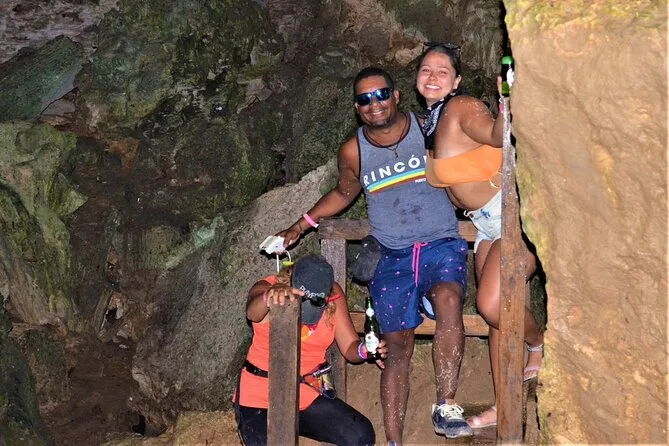 A descrição menciona cavernas para explorar próximas à Praia de Macao como parte da aventura.