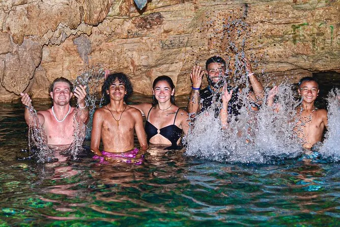 A próxima parte foi mais trepidante — até meus dentes ainda sentem. Chegamos numa gruta, escura e fresca, com água tão cristalina que dava pra ver os dedos dos pés mesmo com o frio na barriga de pular (hesitei, mas pulei). José contou histórias sobre as grutas enquanto nos secávamos; disse que os locais vêm aqui para se refrescar ou pensar. O eco dentro da caverna fazia cada risada parecer maior. Depois voltamos para o buggy para mais um trecho — minha camisa já estava metade molhada, metade coberta de poeira.