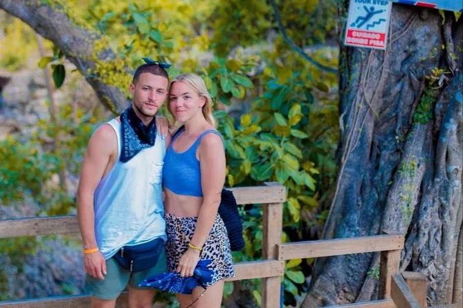 Depois seguimos mais fundo na selva até o silêncio tomar conta, só o som dos pássaros e o motor esfriando. A piscina na caverna parecia coisa de outro mundo — água cristalina e fria, que dava um choque de frescor, mas era perfeita depois daquele calor todo. Alguns pularam direto; eu hesitei, mas acabei entrando também. Até hoje lembro da luz brilhando nas pedras debaixo d’água.