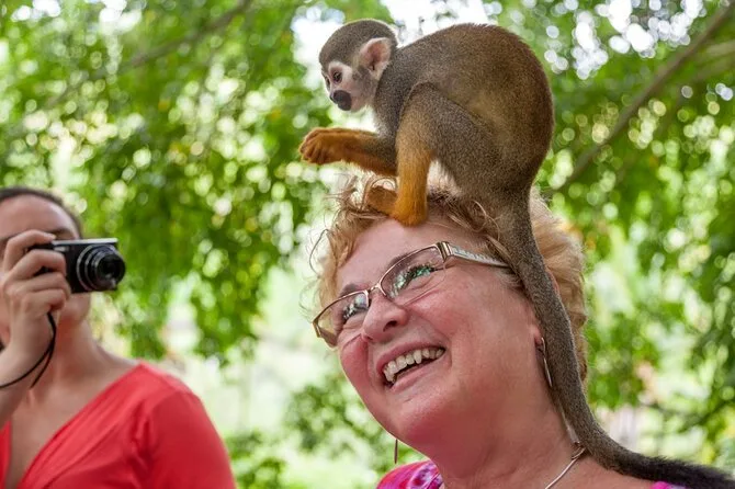 O almoço foi simples, mas delicioso — arroz, frango e algo com coco que até hoje não sei pronunciar direito (Li riu quando tentei em espanhol). Depois veio o Monkeyland. Eles são menores do que eu imaginava — esses macacos-prego — e rápidos demais. Um deles pulou no meu ombro e cheirou meu ouvido; congelei, mas os dedinhos eram macios como linha de algodão. A equipe explicou por que não podemos usar protetor solar nem repelente perto deles (jamais teria pensado nisso), e fez sentido quando vi o quanto eles ficavam curiosos com tudo que levamos.