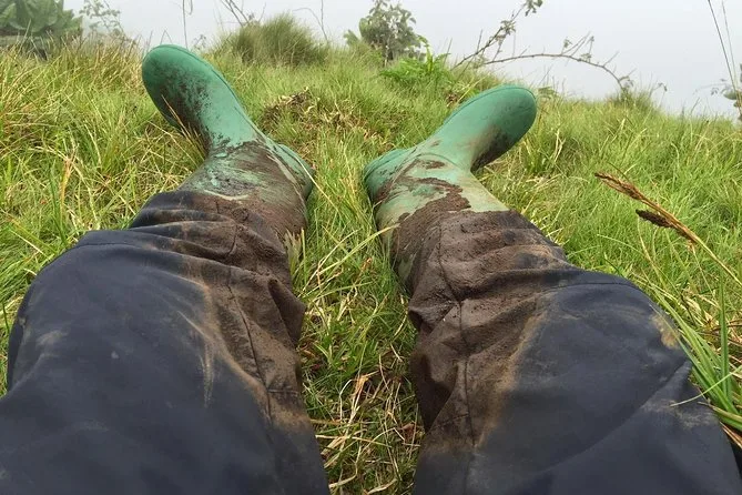 O caminho para o Monte Bisoke não é dos mais fáceis — raízes se entrelaçam sob os pés e você ouve os pássaros cantando lá no fundo da floresta. De vez em quando, Jean-Paul parava para mostrar flores silvestres ou explicar como os locais usam certas plantas como remédio. A subida fica mais íngreme depois de uma hora, mas sempre há algo para distrair: pegadas de gorilas-da-montanha na lama, vistas distantes das colinas do Congo, ou simplesmente o som dos passos sobre o solo vulcânico.