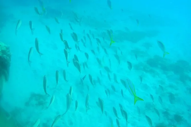 A viagem até Little Bay durou uns dez minutos, mas pareceu mais longa — talvez porque eu não parava de olhar a água mudando de cor sob o sol. Mark explicou como funciona o SNUBA (é tipo scuba, mas o tanque fica flutuando num bote acima da gente) e conferiu as máscaras duas vezes em cada um. Ele brincou com meu “cabelo de snorkel” todo bagunçado — acho que é pra deixar a galera mais à vontade. A água estava quente quando entrei, muito mais do que em casa, e tinha aquele cheiro leve de protetor solar misturado com sal e um toque esverdeado da baía.