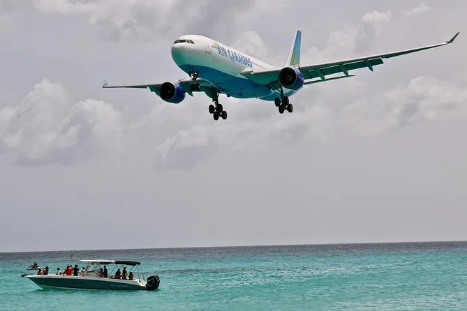 A última parte foi uma bagunça boa: a água de Mullet Bay tem aquele azul turquesa impossível que só se vê em cartão postal e você só acredita quando está flutuando com uma boia e uma cerveja gelada (sim, também incluída). E aí vem o aeroporto Princess Juliana — os aviões passam tão baixos que você sente o impacto no peito antes mesmo de olhar para cima. Alguém no barco riu gritando quando um jato da Air France pousou; acho que todo mundo fez o mesmo.