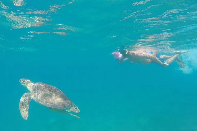 Seu dia inclui transporte do hotel ou cais do navio, todo o equipamento de snorkel e dispositivos de flutuação fornecidos pelo capitão-guia local, bebidas (alcoólicas e não alcoólicas) cortesia, petiscos durante o passeio e almoço servido na areia da Ilha Pinel antes do retorno no fim da tarde — queimadura de sol é opcional, mas provável.