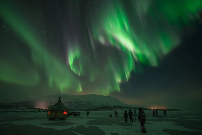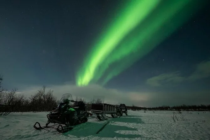 Você vai buscar as luzes a pé perto do teepee, andar numa van 4x4 ou viajar de trenó puxado por moto de neve.