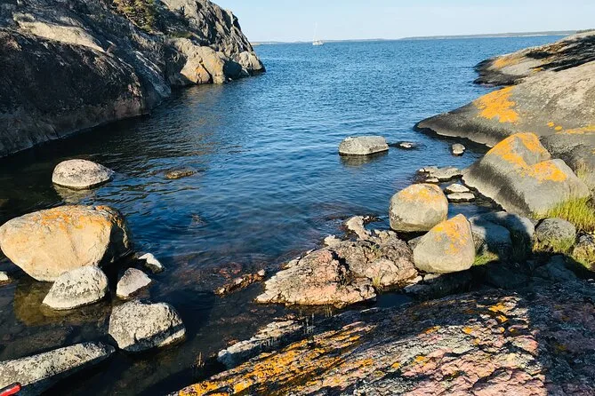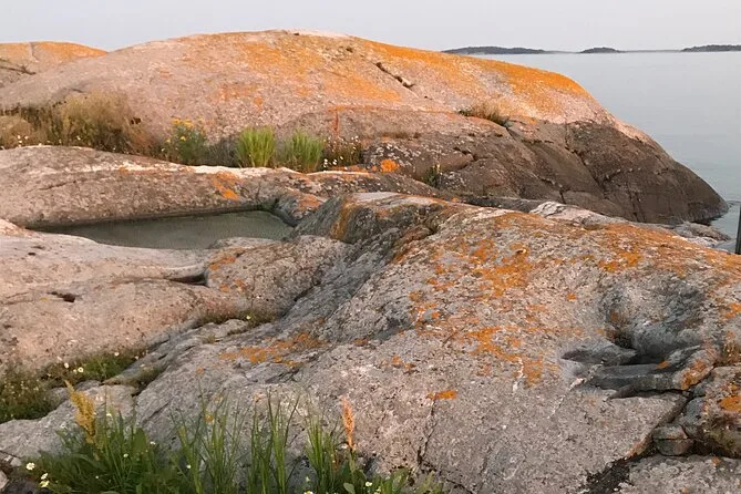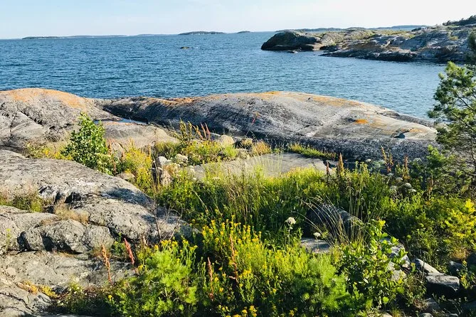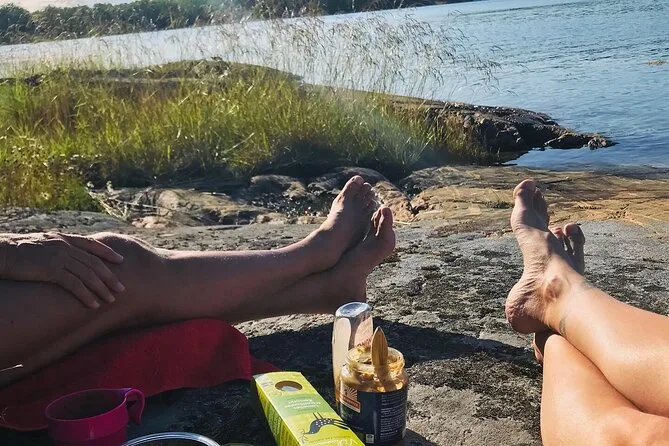 Entre duas ilhas, fizemos uma pausa para o Fika — que é tipo a hora do chá sueca, só que muito melhor do que qualquer pausa para chá que já tive. Alexandra serviu chá verde do seu térmico e distribuiu uns docinhos veganos crus que ela mesma fez (ela também é chef). Tentei dizer “tack” direito e ela sorriu — provavelmente nem cheguei perto do jeito que os locais falam. Sentados numa pedra, tomando chá quente enquanto o céu mudava de cor... isso ficou marcado em mim.