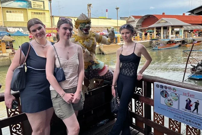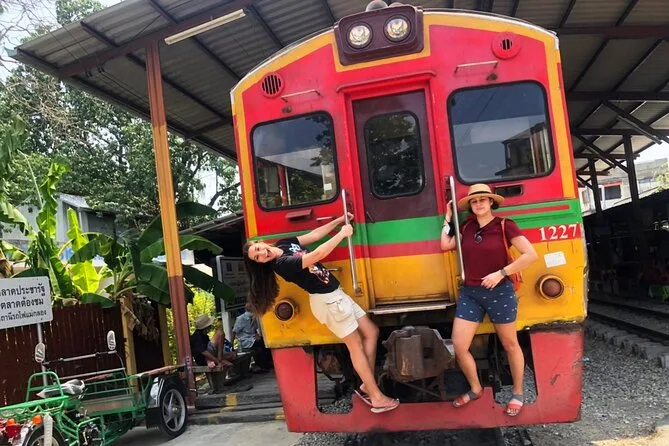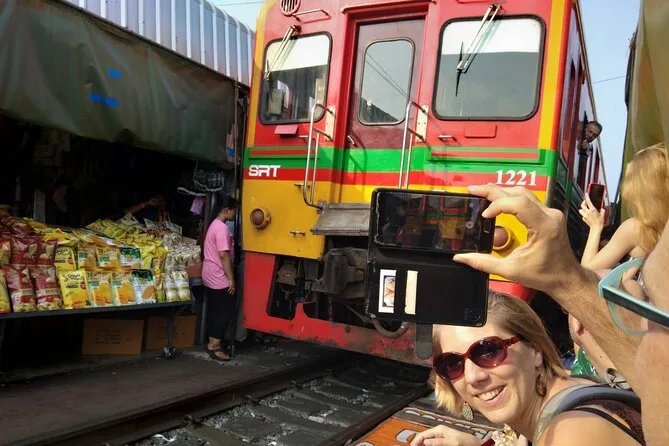 Seu dia inclui traslado privativo do hotel em Bangkok com veículo com ar-condicionado para ida e volta, um guia local simpático fluente no idioma escolhido (inglês ou outros), seguro de acidentes durante o passeio, a experiência de ver o trem passando pertinho no Mercado da Ferrovia Maeklong, visita ao templo Wat Bang Kung abraçado por raízes de figueira, passeio tranquilo pelo Mercado Flutuante de Amphawa com tempo para provar comidas de rua, e um passeio de barco pelo canal para ver vaga-lumes antes de voltar com conforto.