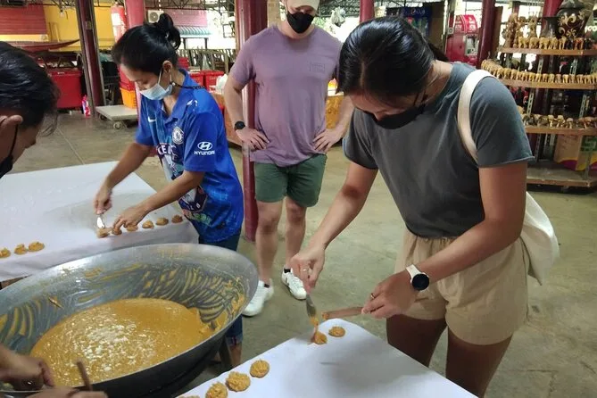 Quando chegamos ao Mercado Flutuante de Amphawa, já estava movimentado, mas sem ser sufocante. Barquinhos alinhados no canal vendiam camarão e lula grelhados — a fumaça subia e se misturava com o ar do rio. Experimentei umas panquequinhas de coco (Nok chamou de “khanom krok” — ela riu quando repeti). Andamos entre as barracas; às vezes alguém cruzava o olhar e só sorria, sem precisar falar nada. A palavra-chave aqui é mesmo “Mercado Flutuante de Amphawa”, porque é onde tudo acontece: comida, gente, barulho, luz refletida na água.