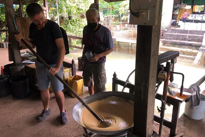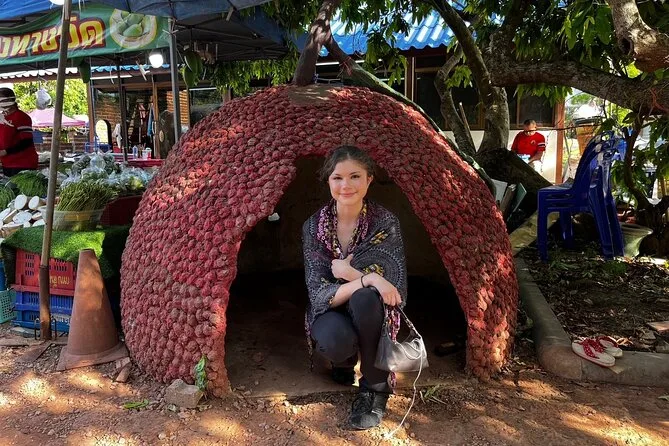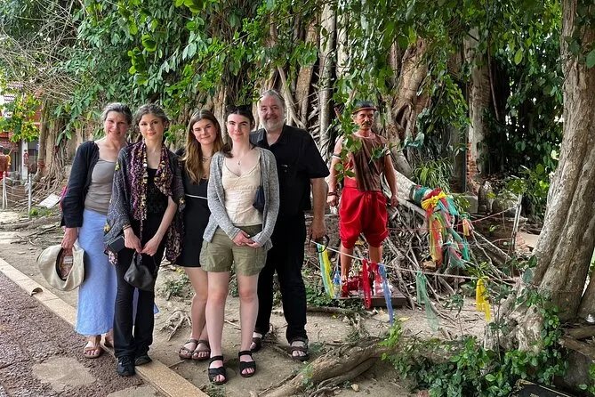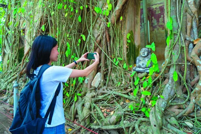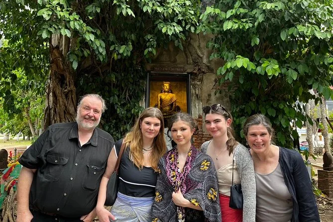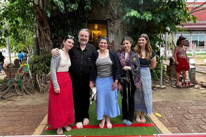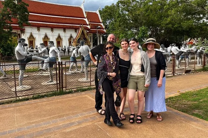 Depois seguimos para Wat Bang Kung. O templo está quase engolido por uma imensa figueira — raízes por todo lado, como se a natureza quisesse escondê-lo. Nok contou sobre os guerreiros que se reuniam ali (ela mostrou umas estátuas em poses de boxe; tentei imitar e quase caí). Lá dentro, o cheiro de incenso e pedra antiga pairava no ar. Moradores acendiam velas pedindo sorte. Gostei de como ninguém tinha pressa — dava pra ficar ali absorvendo tudo com calma.