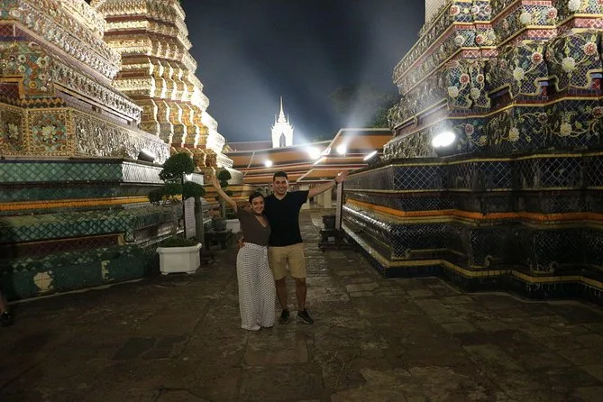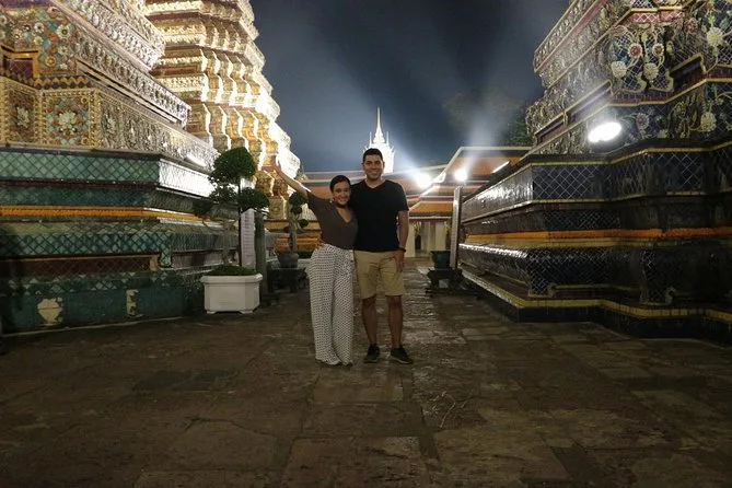 Pedale pelos templos iluminados e mercados animados de Bangkok à noite com um guia local. Desfrute de um jantar tailandês autêntico em Thonburi, atravesse o rio Chao Phraya de balsa, explore Wat Arun e Wat Pho iluminados, passeie pelo mercado de flores perfumado e pela Chinatown cheia de neon — tudo isso sobre duas rodas. Uma experiência que fica na memória muito depois de voltar ao hotel.