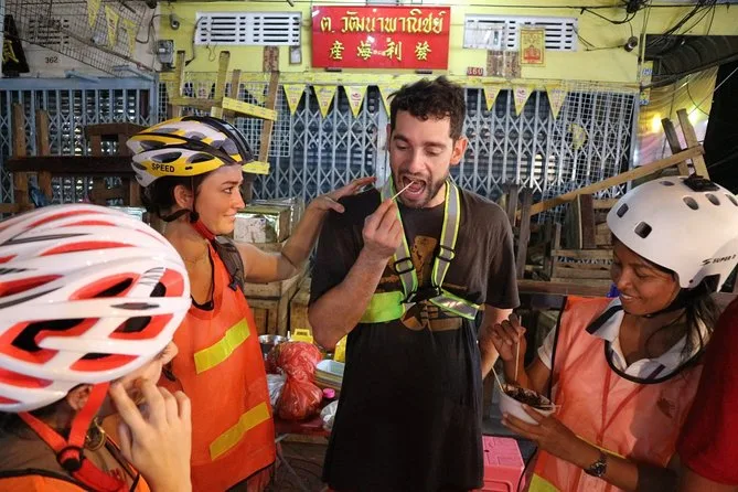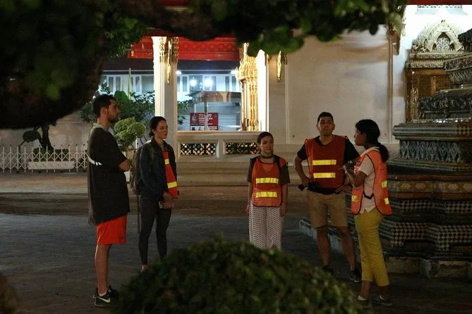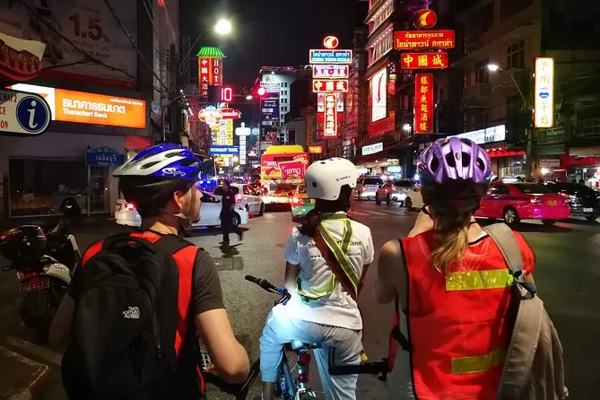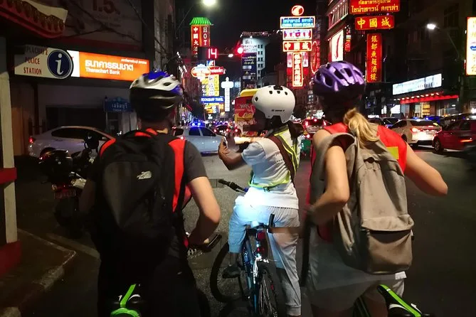 Sua noite inclui bicicleta e capacete, colete refletivo para segurança, água engarrafada durante o passeio, jantar tailandês autêntico em restaurante familiar de Thonburi, visitas guiadas a templos e mercados ao longo do trajeto, além do suporte de um guia local experiente que fala inglês durante toda a experiência.