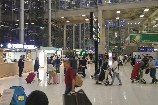 Seu transfer inclui transporte privado do aeroporto Suvarnabhumi ou Don Muang direto para seu hotel em Bangkok com motorista que fala inglês; recepção no desembarque para você ser encontrado facilmente; carro com ar-condicionado; todas as taxas e serviços inclusos; e ajuda com as malas na porta do hotel.