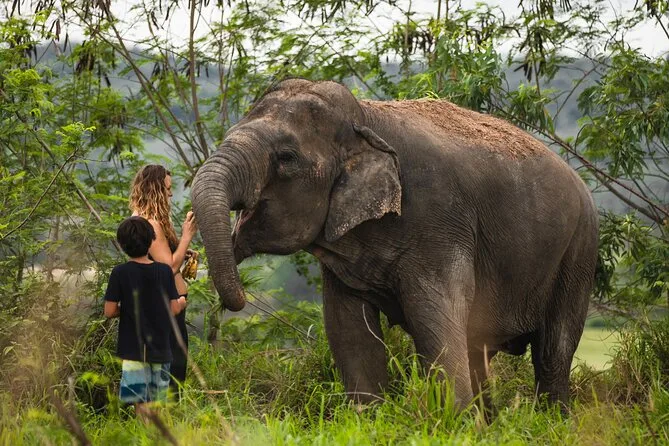 Alimentamos os elefantes com umas bolinhas de banana pegajosas — minhas mãos ficaram com cheiro doce por horas. Uma das fêmeas mais velhas ficava cutucando meu braço pedindo mais; Lek contou o nome dela, mas confesso que esqueci rapidinho (nome tailandês é complicado pra mim). Ele foi contando um pouco da história de resgate de cada elefante enquanto caminhávamos ao lado deles — nada dramático ou exagerado, só simples e tocante. O chão estava enlameado da chuva da noite anterior, então meus sapatos provavelmente nunca mais serão os mesmos, mas valeu muito a pena.