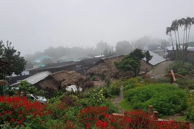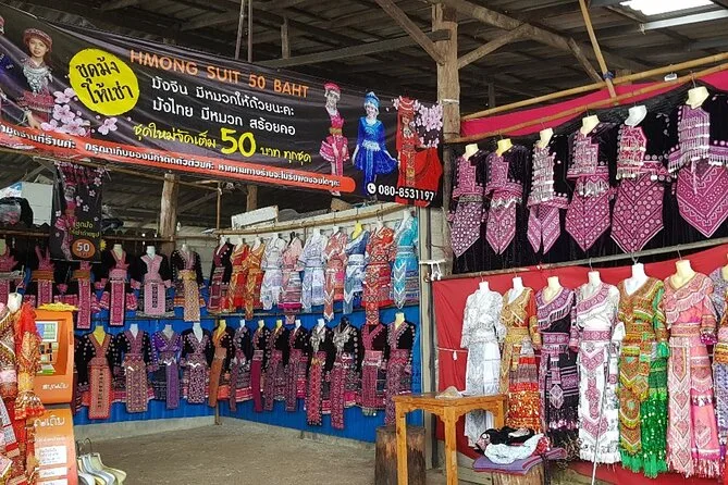 Depois seguimos mais alto até uma vila da tribo Hmong escondida na encosta. Não era nada do que eu esperava — bem menos turística do que imaginei, com crianças correndo entre casas de madeira e mulheres mais velhas tecendo tecidos coloridos na porta de casa. Uma delas me deixou experimentar uma jaqueta (fiquei meio bobo; ela riu e ajeitou minha gola). O ar tinha cheiro de fumaça de lenha misturado com algo doce fritando perto dali. Nok contou um pouco da história deles enquanto passeávamos por jardins cheios de ervas que eu nem conhecia. Ainda deu tempo de ver alguns tecidos artesanais — comprei uma bolsinha pequena que me lembrou a luz daquela manhã na montanha.