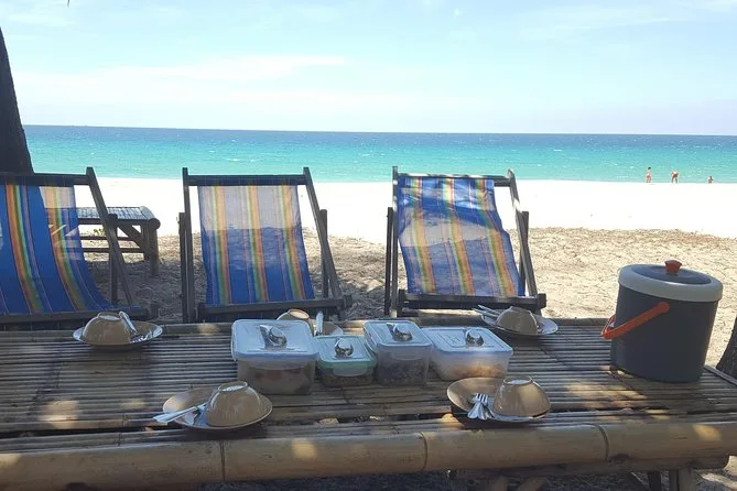 Sim, um almoço no estilo local é servido numa praia tranquila.