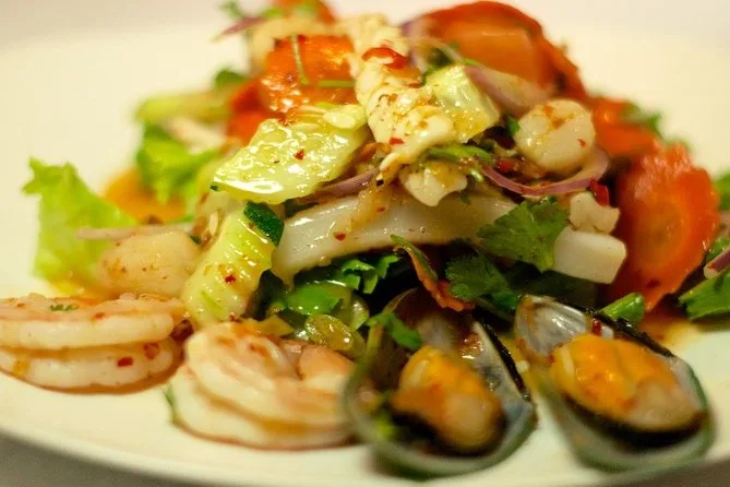 O cardápio geralmente inclui salada apimentada de frutos do mar (Yum Thalay), sopa Tom Yum Goong, curry verde de frango (Gaeng Kiew Wan Gai) e frango salteado com castanha de caju.