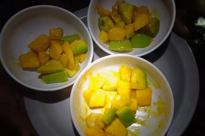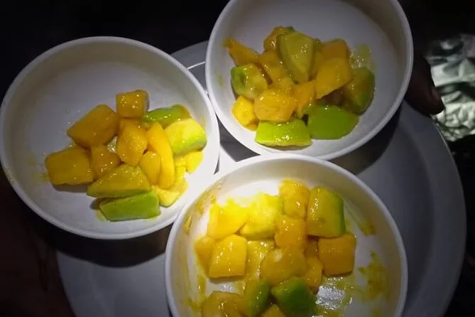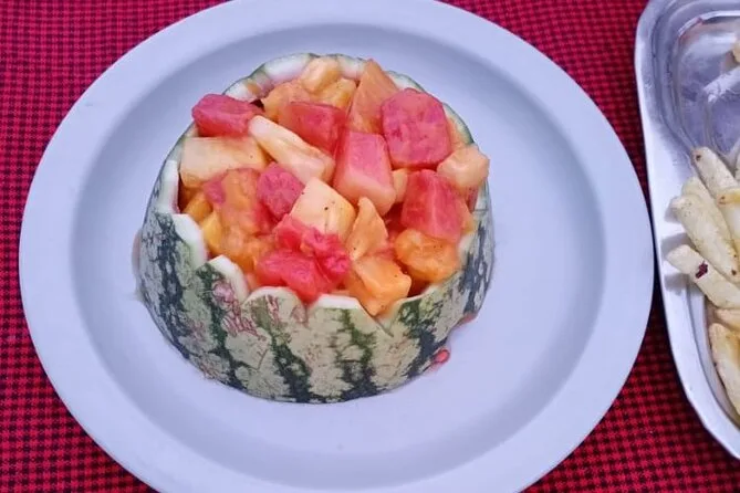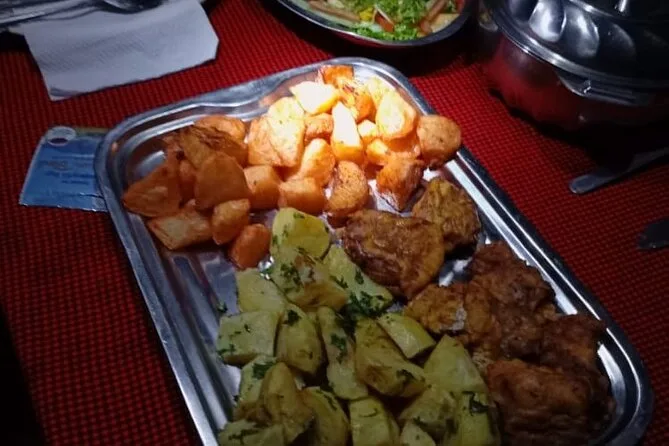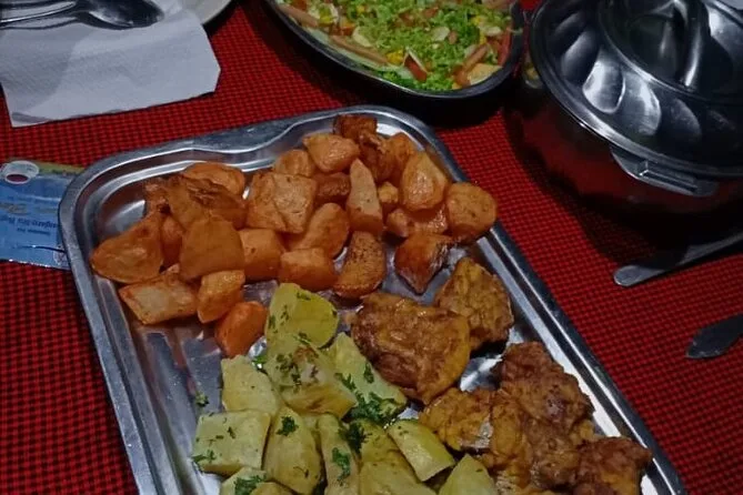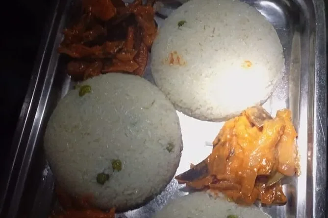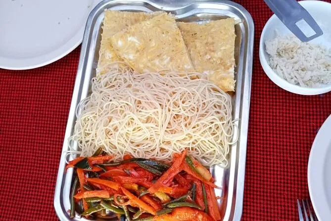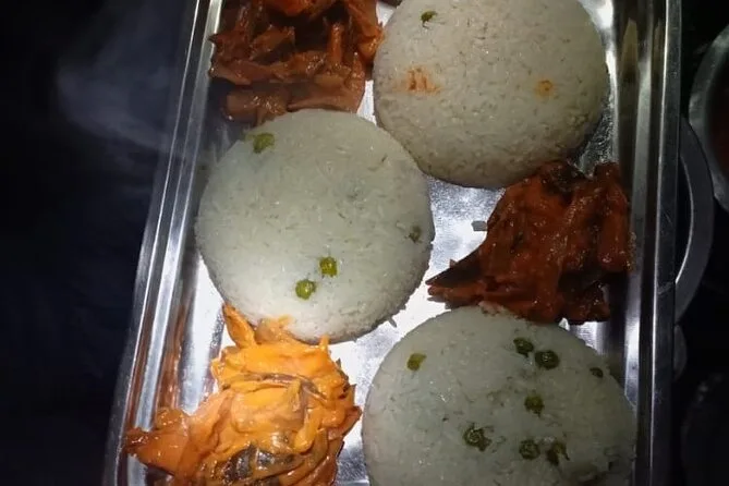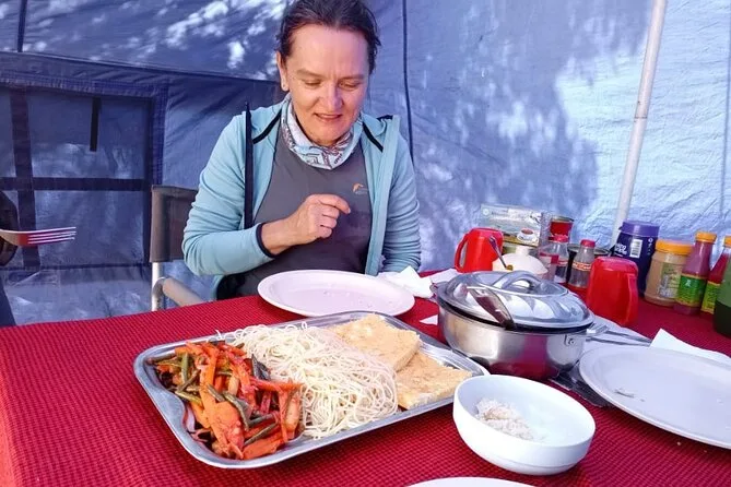 Você vai receber porções generosas de refeições frescas todos os dias — pratos com arroz, legumes, ovos, sopas — e bastante água purificada durante toda a subida.