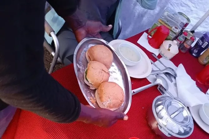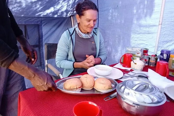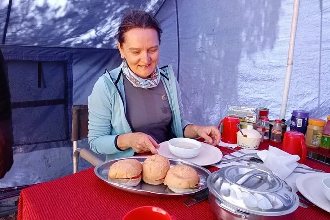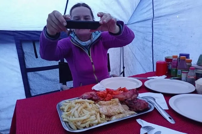 Seu trekking inclui todas as taxas do parque, resgate, guias experientes, carregadores bem tratados (eles são verdadeiros heróis!), refeições frescas e nutritivas diárias (mesmo em altitude), barracas limpas com mesas e cadeiras para as refeições, água purificada sempre disponível — e barracas de qualidade preparadas para o clima da montanha.
