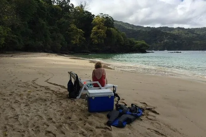 Charlotteville parecia um mundo à parte — silenciosa, com o mar do Caribe batendo quase na estrada. De lá, embarcamos num barquinho com nossa própria caixa térmica cheia de rum punch caseiro e bebidas geladas. Pirates Bay só dá para chegar de barco ou por uma trilha íngreme, então estávamos só nós e o som da água. O almoço foi comida caribenha de verdade — frango ao curry, arroz, callaloo — e ficou ainda melhor com a areia entre os dedos. O snorkel ali é surreal: cardumes de blue tang nadando entre os corais, a luz do sol dançando debaixo d’água.
