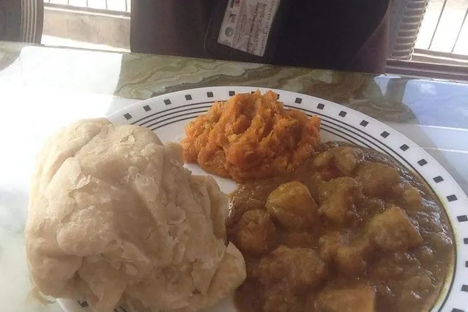 Você vai experimentar uma refeição típica do Caribe — geralmente frango ao curry ou peixe, arroz, callaloo e saladas. Opções vegetarianas estão disponíveis se avisar antes.