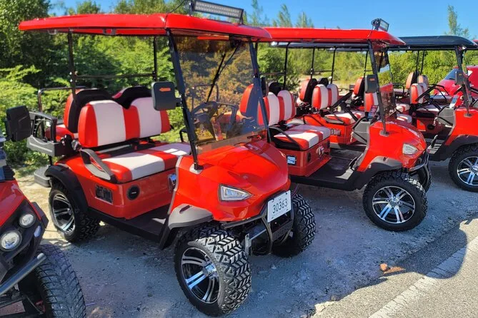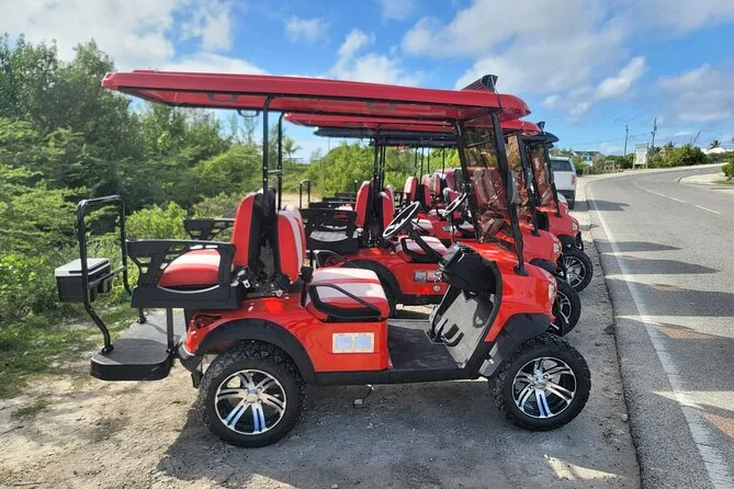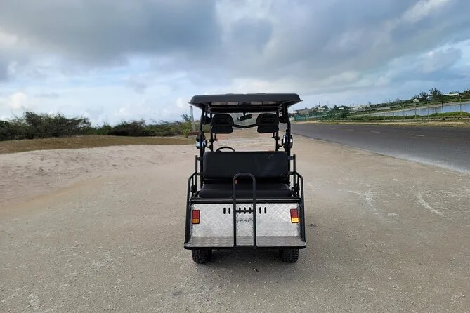 Seu dia inclui o uso privado de um carrinho de golfe UTV 4 lugares confortável, entregue no local combinado — com cintos de segurança para todos, teto estendido para sombra ou chuva, sistema de som bluetooth para você tocar sua música enquanto explora Grand Turk no seu ritmo — além de combustível e suporte local durante o passeio.