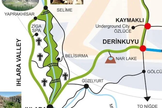 O Vale de Ihlara fica a cerca de 80 km de Göreme; o trajeto de minibus leva entre 1 e 1,5 horas em cada sentido.