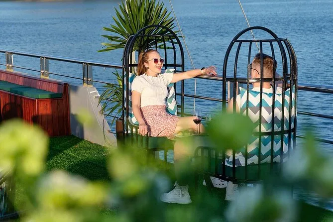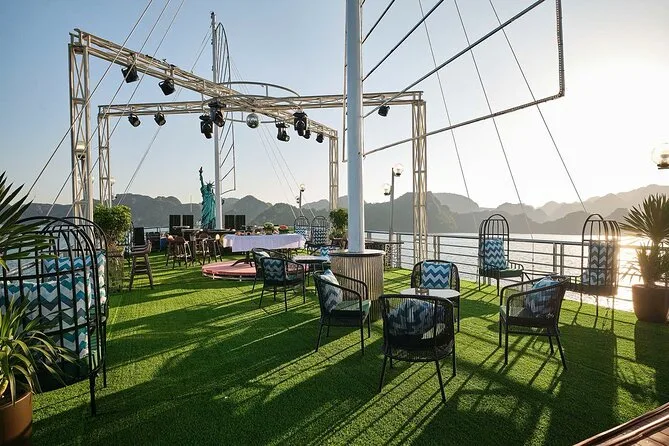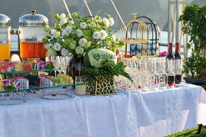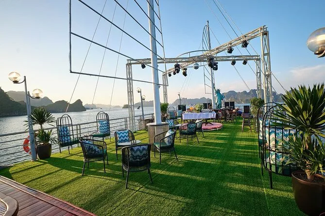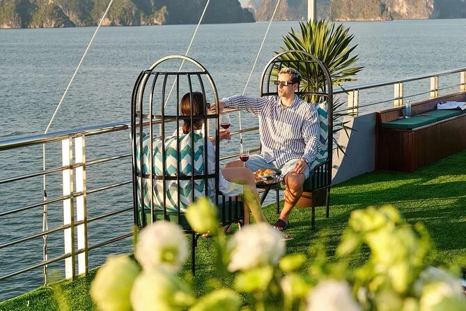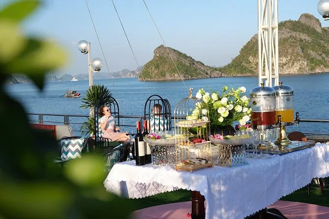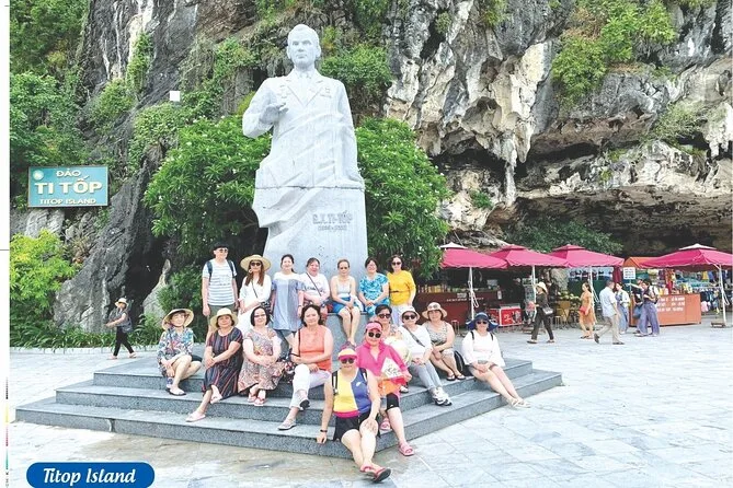 Seu dia inclui busca no hotel no Bairro Antigo de Hanoi (se selecionado), traslado ida e volta por estrada até o porto de Halong, transporte entre os pontos turísticos em barco de luxo com deck para sol e piscina, almoço vietnamita de frutos do mar ou vegetariano a bordo, guia profissional falando inglês durante todo o passeio, paradas para caiaque ou passeio de barco de bambu (taxa extra), tempo para explorar a Gruta da Surpresa e a Ilha Titop para nadar ou fazer trilha com vista panorâmica antes do retorno a Hanoi à noite. As taxas de entrada são pagas separadamente na saída.