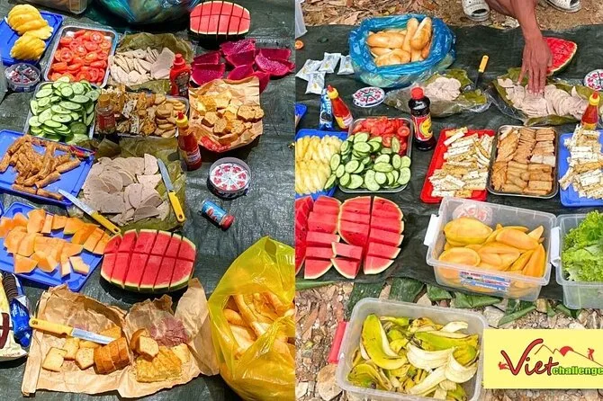 Sim, um picnic vietnamita com pão, carne de porco, frutas e água purificada é servido no topo da cachoeira mais alta.