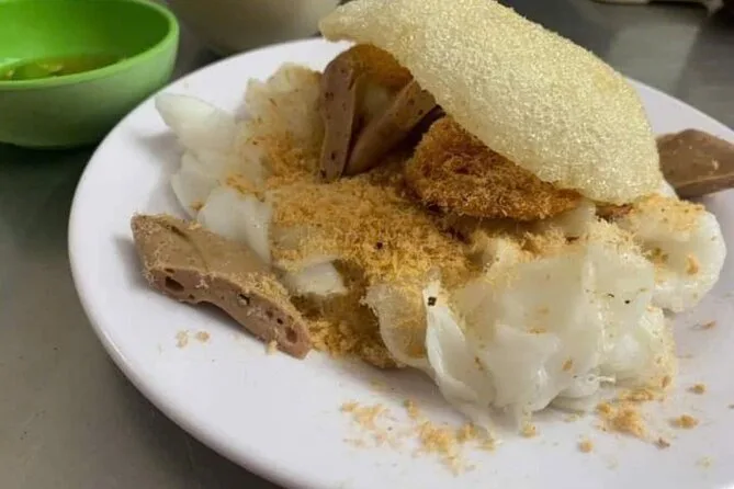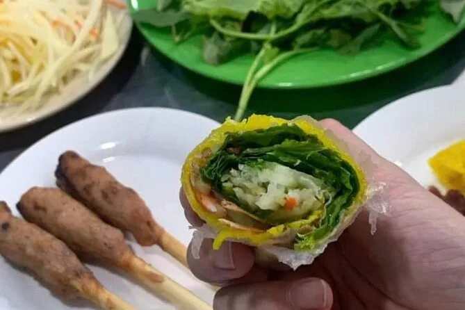 Você vai experimentar pratos como Banh Loc, “pizza vietnamita”, macarrão My Quang, espetinhos Nem Lui, carnes ou frutos do mar grelhados (dependendo do menu), chá verde e sobremesa de gelatina de coco.