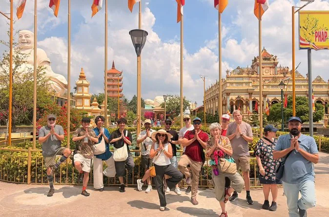 Confesso que não esperava sentir um cheiro tão fresco e verde ao sair de Ho Chi Minh. As janelas da van embaçaram um pouco enquanto passávamos por aqueles campos intermináveis de arroz — tentei contar os búfalos d’água, mas perdi a conta. Nosso guia, Hien, não parava de contar histórias da infância dele por aqui. Ele já apontou o Pagode Vinh Trang antes mesmo de pararmos, dizendo que as estátuas de Buda “já estavam sorrindo para a gente”. Não sei se era verdade, mas isso me fez sorrir também.