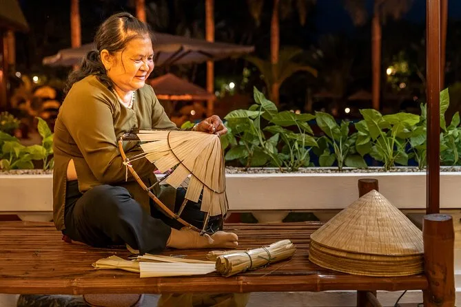 O almoço foi servido no jardim de uma casa, sob uma sombra formada por árvores de jaca. A anfitriã nos ensinou a fazer “banh khot” — pequenas panquecas salgadas feitas na brasa e cobertas com camarão. Provamos chá de mel da fazenda de abelhas deles (cuidado com as abelhas curiosas) e um licor de arroz caseiro que está na família há três gerações. Em outra rua, conhecemos uma senhora mais velha que tecia cestos com jacinto d’água — as mãos dela se moviam tão rápido que era difícil acompanhar.