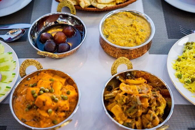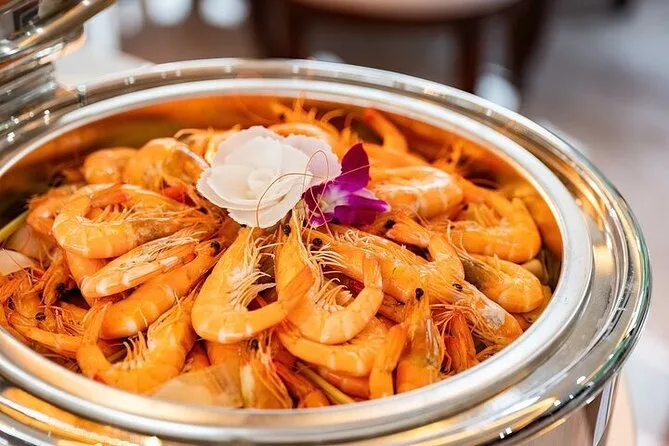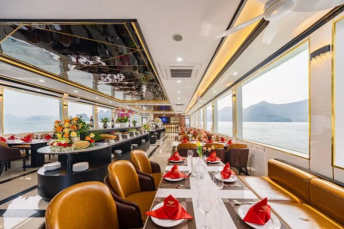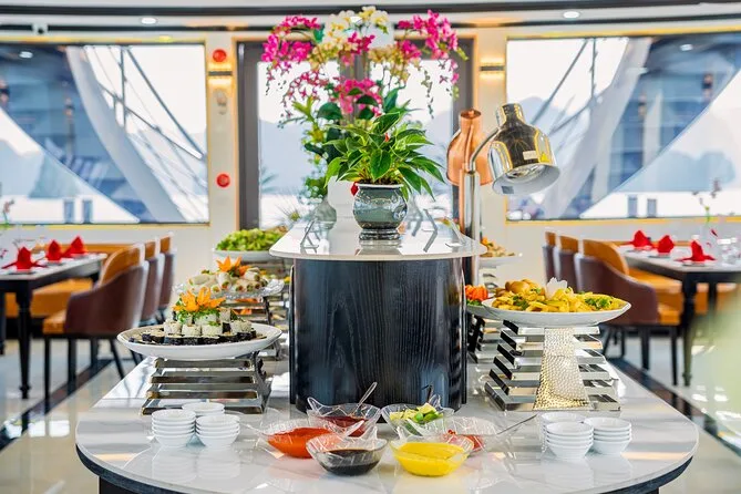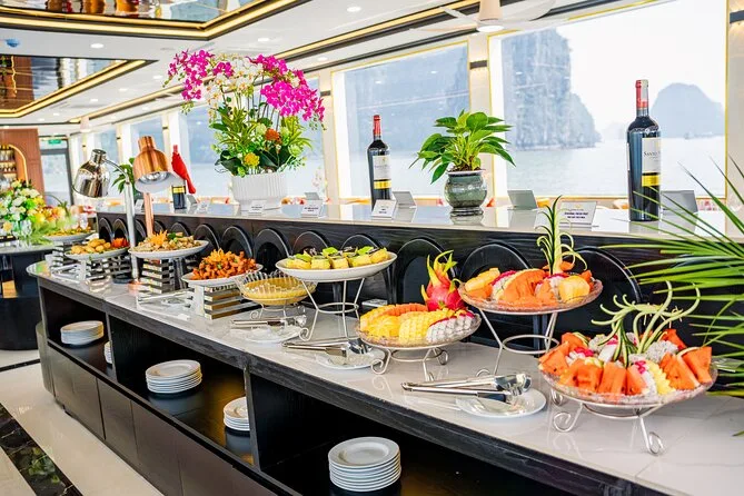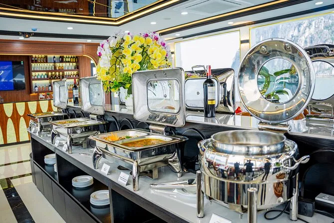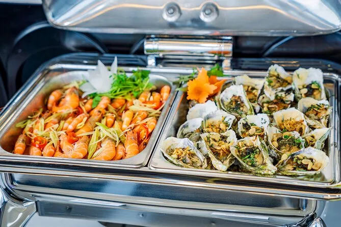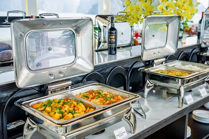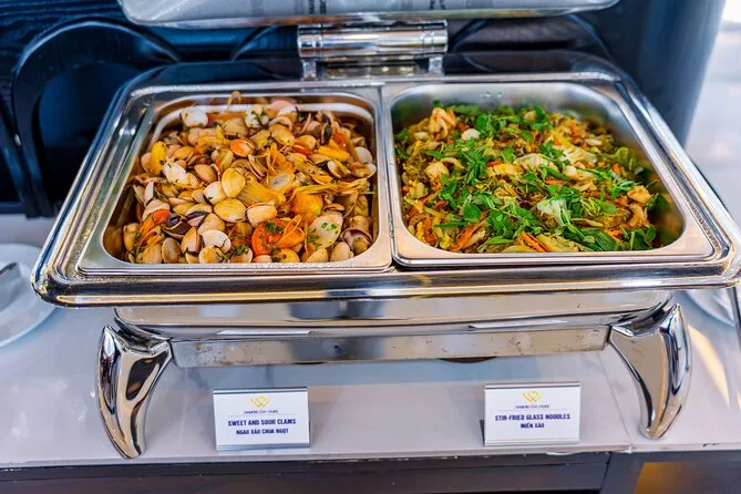 Um almoço buffet com pratos vietnamitas, frutos do mar, opções ocidentais e vegetarianas é servido a bordo.