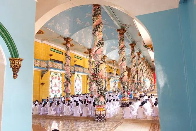 Na hora do almoço, estávamos no Templo Cao Dai em Tay Ninh — já tinha visto fotos, mas nada prepara para aquelas cores. Dragões enrolados nas colunas, fiéis vestidos de branco se movendo silenciosamente. Hanh sussurrou que a oração do meio-dia é quando “os mundos se encontram”, e isso soou poético até eu ver: pessoas cantando juntas sob um enorme olho pintado no teto. É uma mistura de religiões — Jesus ao lado de Buda e Brahma — e de alguma forma funciona. Tentei repetir uma das saudações; Li riu quando eu errei, mas me ensinou de novo.