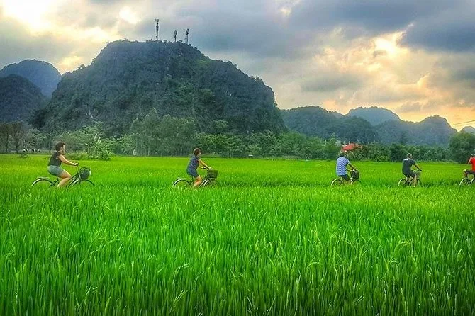 O passeio inclui visita à antiga capital Hoa Lu, passeio de barco em Tam Coc pelas cavernas, pedaladas pelas vilas locais e almoço.