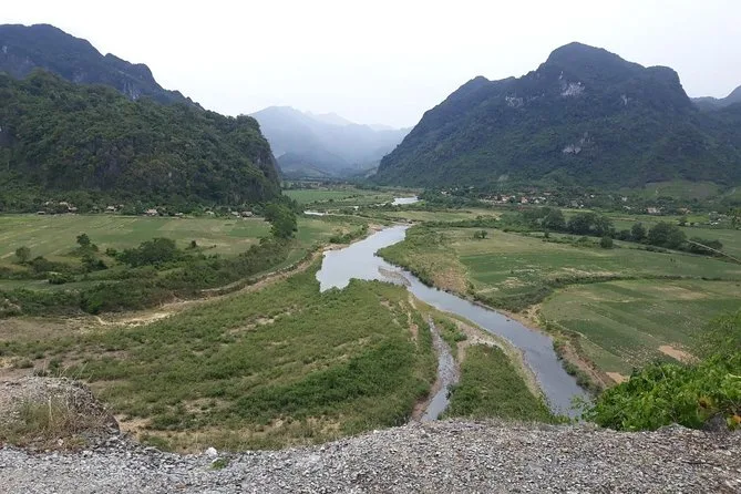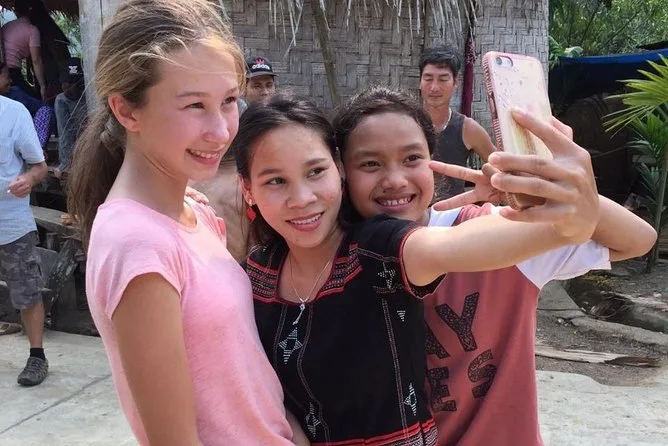 Não seguimos pelas rodovias. Minh nos levou por estradinhas sinuosas onde agricultores locais acenavam dos campos e pequenas barracas à beira da estrada vendiam arroz pegajoso envolto em folhas de bananeira. Em um momento, paramos em um mirante que não estava marcado em nenhum mapa—apenas uma dica do Minh, que conhece bem a região. A vista se estendia sobre os arrozais em mosaico e dava para ver crianças brincando perto de uma curva do rio lá embaixo. O almoço foi simples, mas delicioso: frango grelhado e verduras frescas em um lugar familiar onde conheciam nosso guia pelo nome.