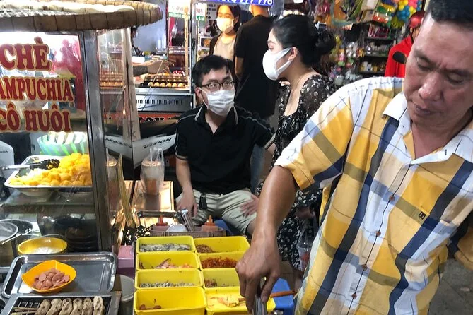 Se você escolher o tour noturno (como eu fiz), a experiência fica ainda mais animada. Passamos pelo Distrito 10 até o mercado de flores Ho Thi Ky. Escondido num beco, o lugar explode em cores e conversas mesmo depois de escurecer. O mercado cambojano ao lado é uma loucura — vendedores assando carne com queijo, vendendo chá de pêssego em copos plásticos e servindo sorvete de abacate em potinhos de papel. Experimentamos a “pizza vietnamita” (não tem nada a ver com pizza de verdade, mas é deliciosa) sentados em banquinhos minúsculos rodeados por moradores. O cheiro de flores misturado com alho frito dominava o ar. Sério, eu poderia ter ficado ali a noite toda.