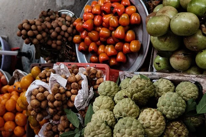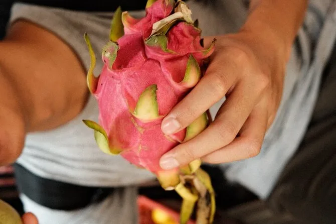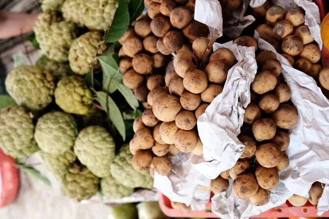 Não esperava acabar quase na sala de estar de alguém para provar curry. O lugar não tinha placa, só um cardápio escrito à mão colado na parede. Curry de cogumelos com leite de coco sobre arroz grudento, acompanhado de um chá com um leve toque de capim-limão. Linh nos ensinou a enrolar rolinhos primavera na alface — os meus desmontaram, mas ninguém ligou. Em um momento, ela distribuiu frutas conforme o signo do zodíaco; eu ganhei longan e até hoje não sei bem como descrever o sabor, doce e com uma cremosidade estranha. O mercado local era um caos: crianças correndo entre pilhas de pitayas, vendedores gritando preços, o ar pesado de umidade e mangas maduras.
