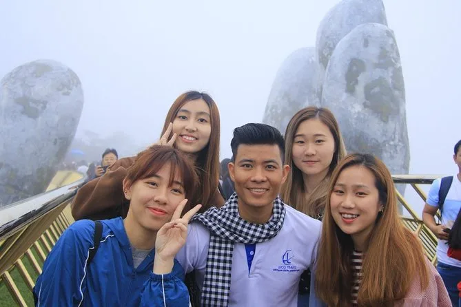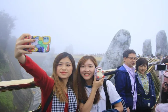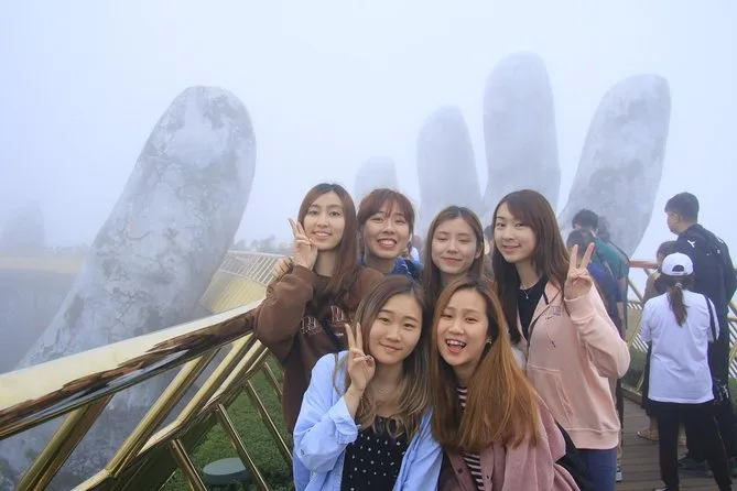 Ba Na Hills estava mais fresco do que eu esperava — literalmente! Leve uma jaqueta leve mesmo que esteja quente em Da Nang, porque lá em cima, no teleférico (que é absurdamente longo), às vezes as nuvens passam por cima da sua cabeça. As adegas de vinho francesas subterrâneas cheiram a mofo e antiguidade; o Fantasy Park é barulhento, cheio de crianças correndo pelos fliperamas. Mas nada supera estar na Golden Bridge — aquelas mãos gigantes de pedra segurando a passarela fazem você se sentir flutuando sobre as árvores. Tirei fotos demais aqui.