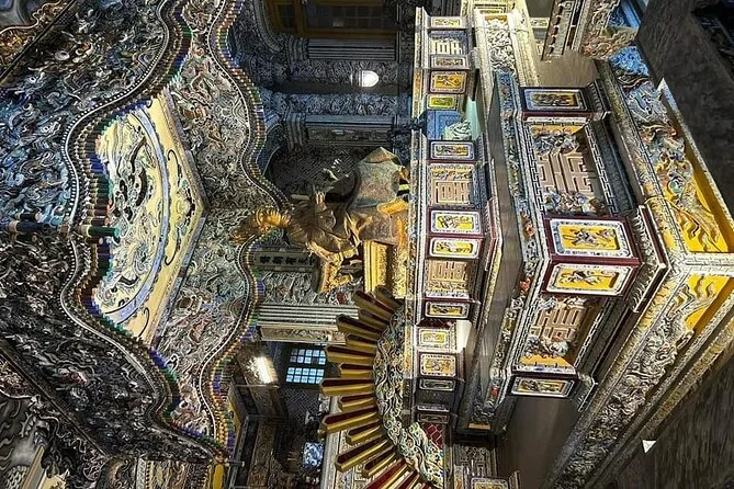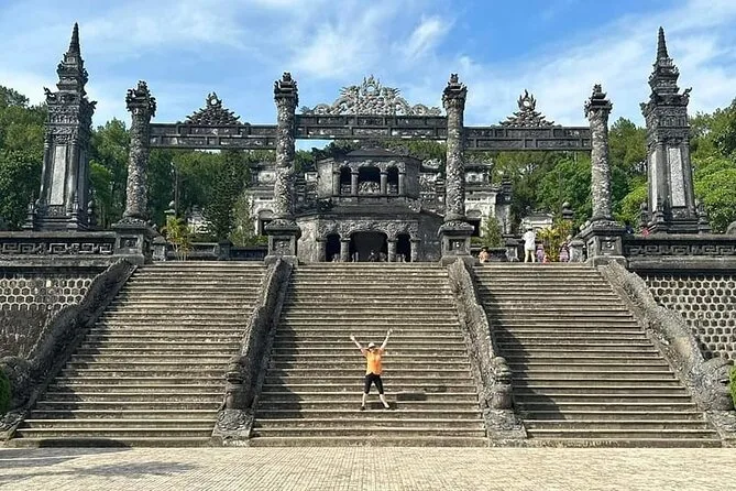 O almoço foi num cantinho escondido perto do Mercado Dong Ba — nada sofisticado, mas o bun bo Hue era picante o suficiente para nos fazer suar. Depois, seguimos para a Tumba de Khai Dinh. Esse lugar é incrível — uma mistura da tradição vietnamita com um toque francês, tudo no alto de uma colina íngreme com degraus cobertos de musgo e dragões esculpidos por toda parte.