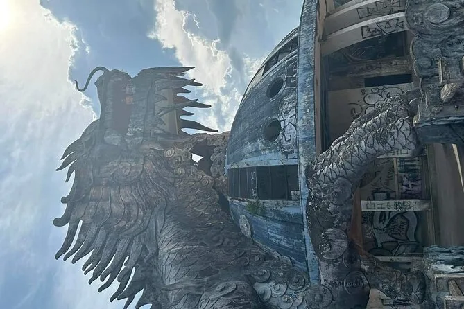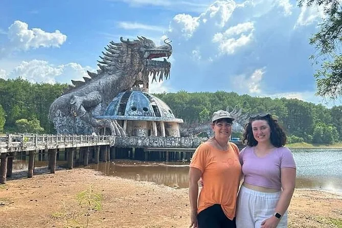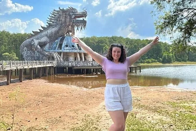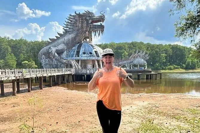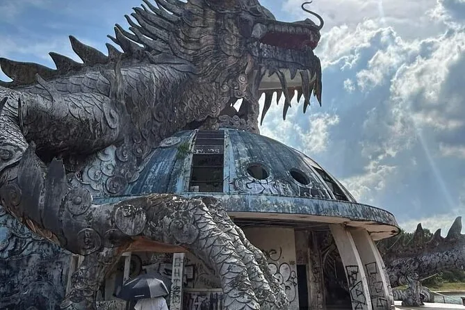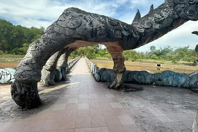 A última parada? O parque aquático abandonado do Lago Thuy Tien. O silêncio aqui é estranho, só quebrado pelos pássaros e o som dos cascalhos sob os pés. A escultura gigante do dragão domina tudo — por dentro é escuro e ecoa, cheio de grafites e tanques quebrados onde crocodilos viviam (ainda há placas de aviso). Da boca do dragão, a vista sobre o lago e os pinheiros é estranha, mas tranquila — parece que você entrou em outro mundo.