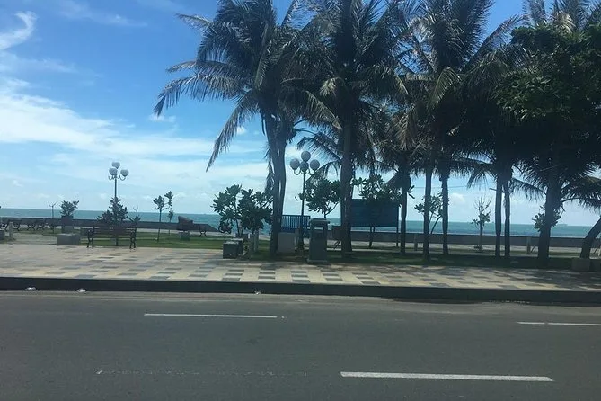 Por volta das 10h30, chegamos à praia de Thuy Van—os locais a chamam de Back Beach. A areia aqui é macia e se estende por um espaço que parece não ter fim; tirei os sapatos e deixei os dedos afundarem. Há uma brisa salgada que gruda na pele e o som das ondas se mistura com os vendedores anunciando milho assado ou chá gelado. Você terá um tempo livre para nadar ou simplesmente passear—confesso que passei a maior parte do tempo observando as pessoas sob um guarda-sol listrado.