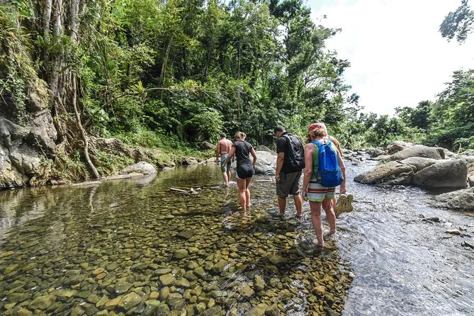 Your day includes complimentary hotel pickup and drop-off from selected areas in San Juan (Old San Juan, Condado or Isla Verde), all necessary safety gear like lifejackets plus bottled water and light snacks along the way. You’ll have a certified local guide leading every step—from rainforest hikes to waterfall swims—before stopping for lunch at Luquillo Kiosks (meal cost not included).