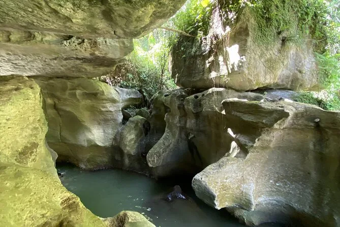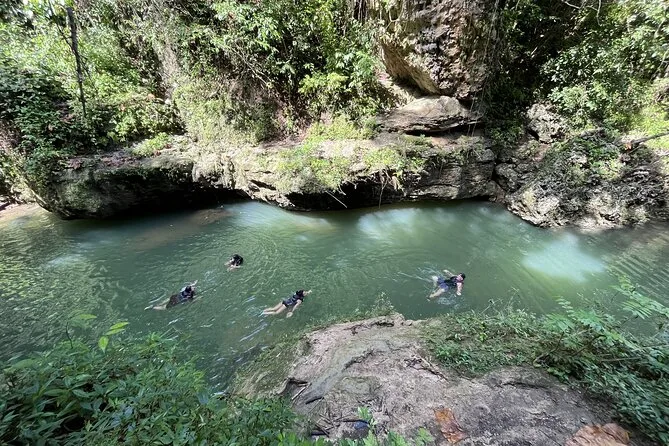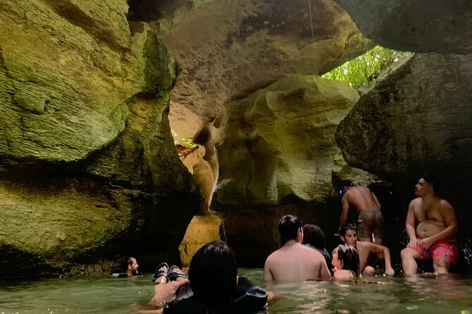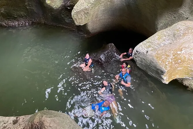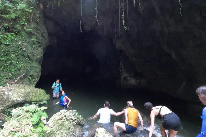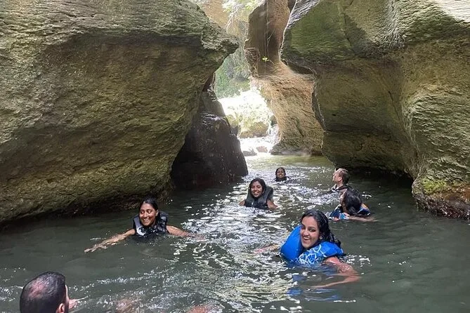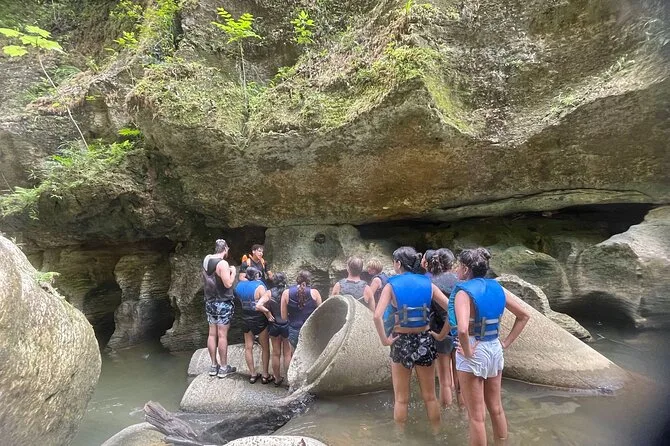 You’ll squeeze through ancient caves near Charco Azul with a local guide, spot Taíno carvings by hand, swim in underground rivers, and relax by turquoise pools surrounded by rainforest cliffs. Pickup, snacks, life vests, and all gear are included so you can just focus on exploring — or cliff jumping if you’re feeling bold.